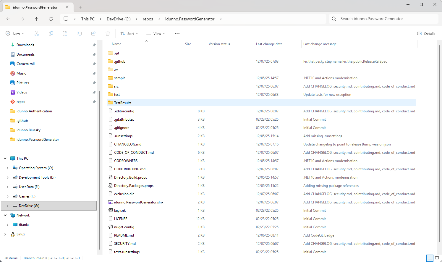 Windows Explorer can now show Git commit messages, the last changed date, and a version status of the file is modified and needs to be committed, as well as branch information in the status bar.