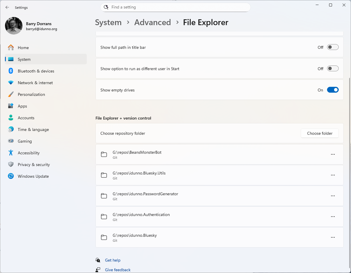 Now scroll down and you'll a section titled "File explorer and version control". Click Choose Folder and pick a folder containing a Git repository.